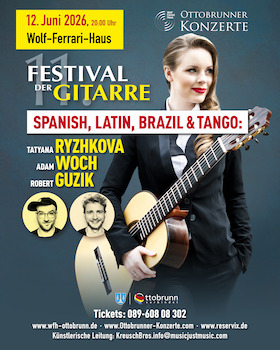 Zum bereits 11. Mal ruft das Festival der Gitarre nach Ottobrunn in das Wolf-Ferrari-Haus. Lernen Sie die Kunst der Gitarre in verschiedenen Konzerten, Ausstellungen, Workshops und Meisterklassen kennen. Lassen Sie sich diese Möglichkeit auf keinen Fall entgehen und wohnen Sie 2026 vom 12. bis 14. Juni dem Festival der Gitarre bei. Jetzt Tickets über Reservix sichern.
